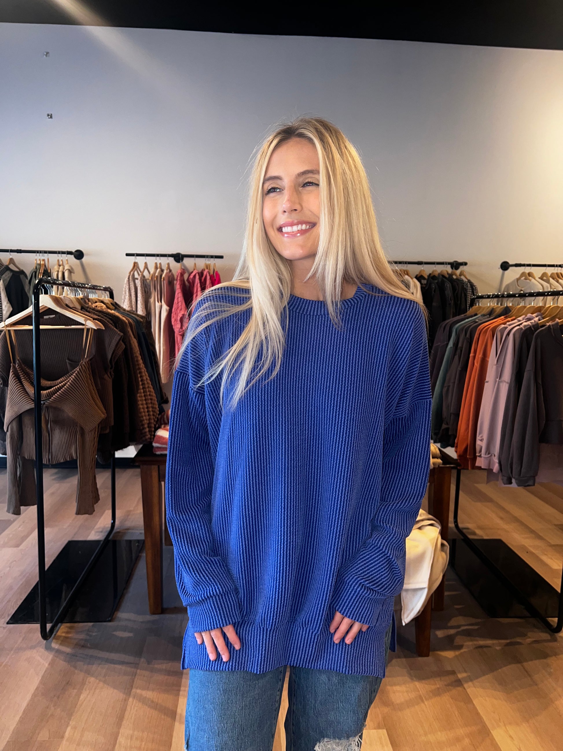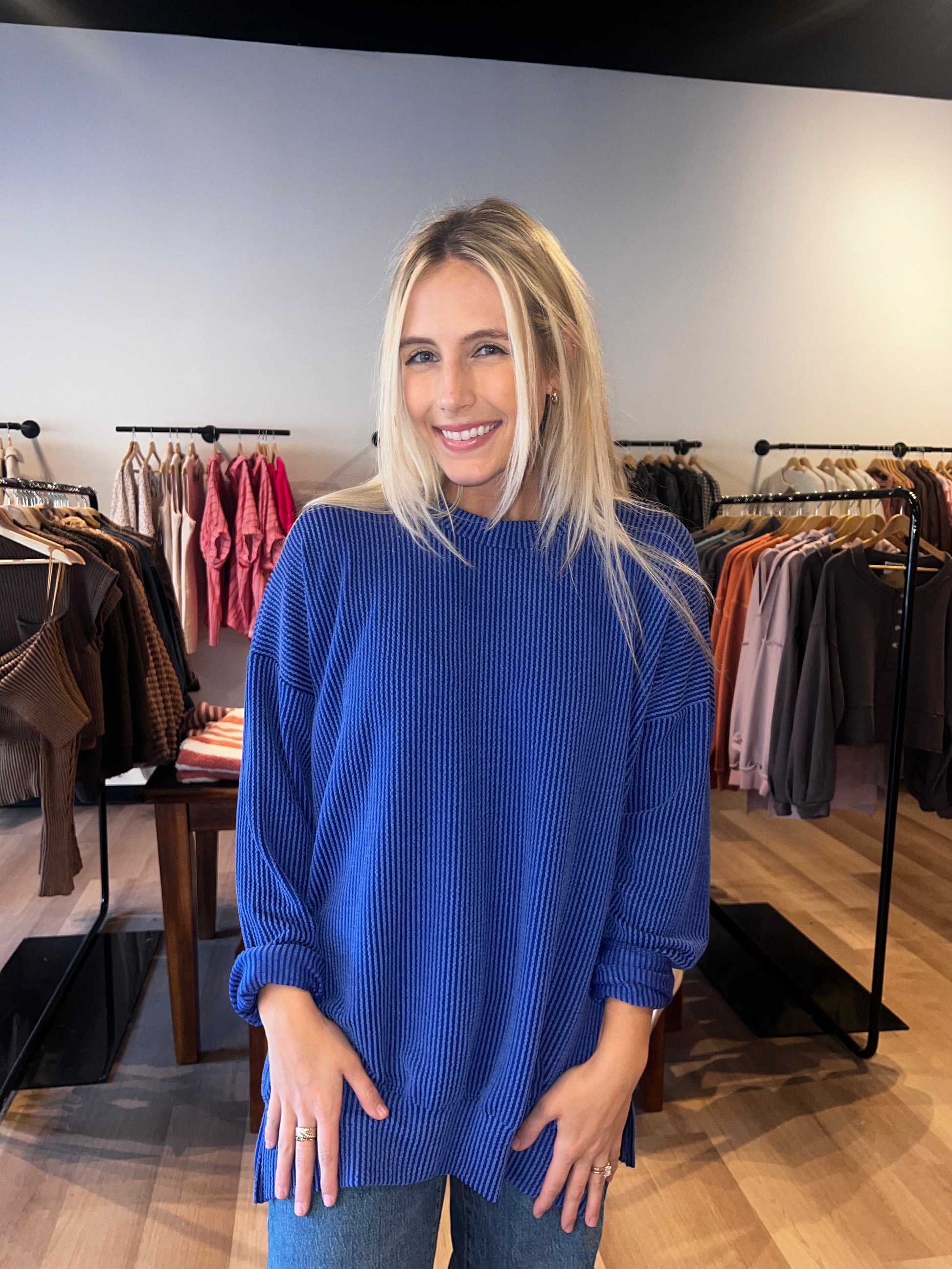 Soft and Stretch oversized ribbed sweatshirt with slide slit.